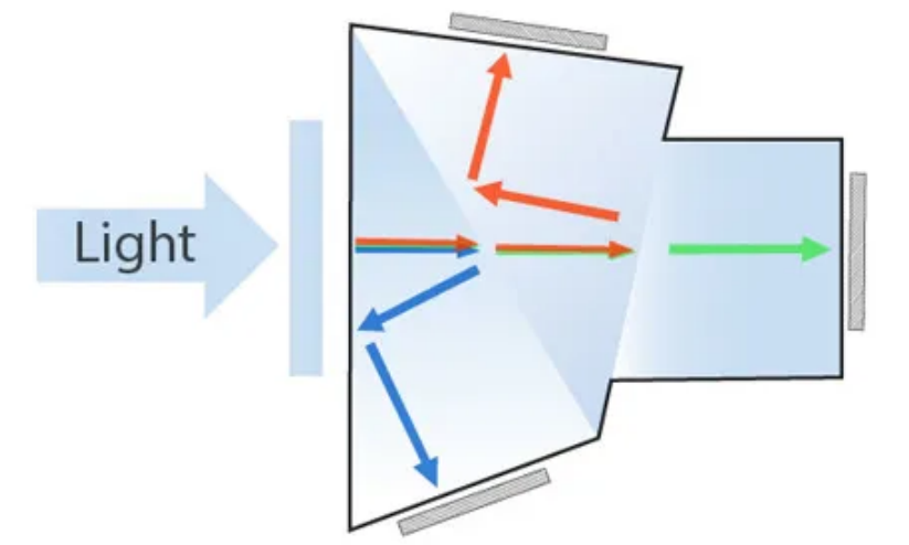 棱镜模块由多个部分组成,包括二向色镜,尽管二向色镜透光率曲线转换非常理想,但是光的干涉决定了实际效果与入射角相关,即透光率会随着入射角度变化而变化,这可能导致颜色阴影问题,入射角越大,阴影效果越明显。