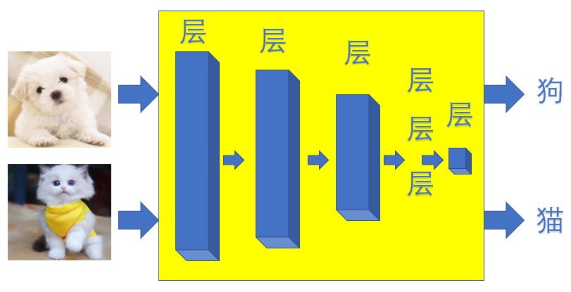 看到下图中的大概过程了吗?没错,深度学习的流程就是经过层层筛选、层层选拔、层层递进,然后才可以给出最终的答案,所以这个“深”就体现在这个分“层”上。