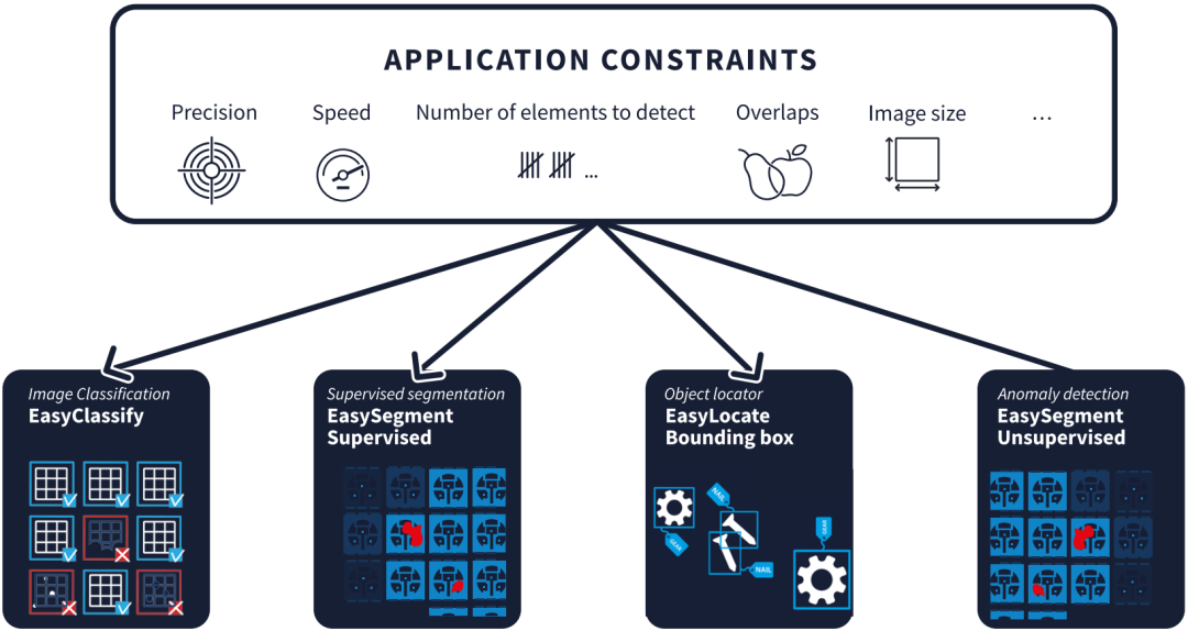 在无监督模式下,EasySegment 学习何为“优良”样本(即无任何缺陷的样本)。它在训练时只使用“优良”样本图像,即可使用该工具将新图像按优良或缺陷进行分类,并分割出这些图像中的缺陷。